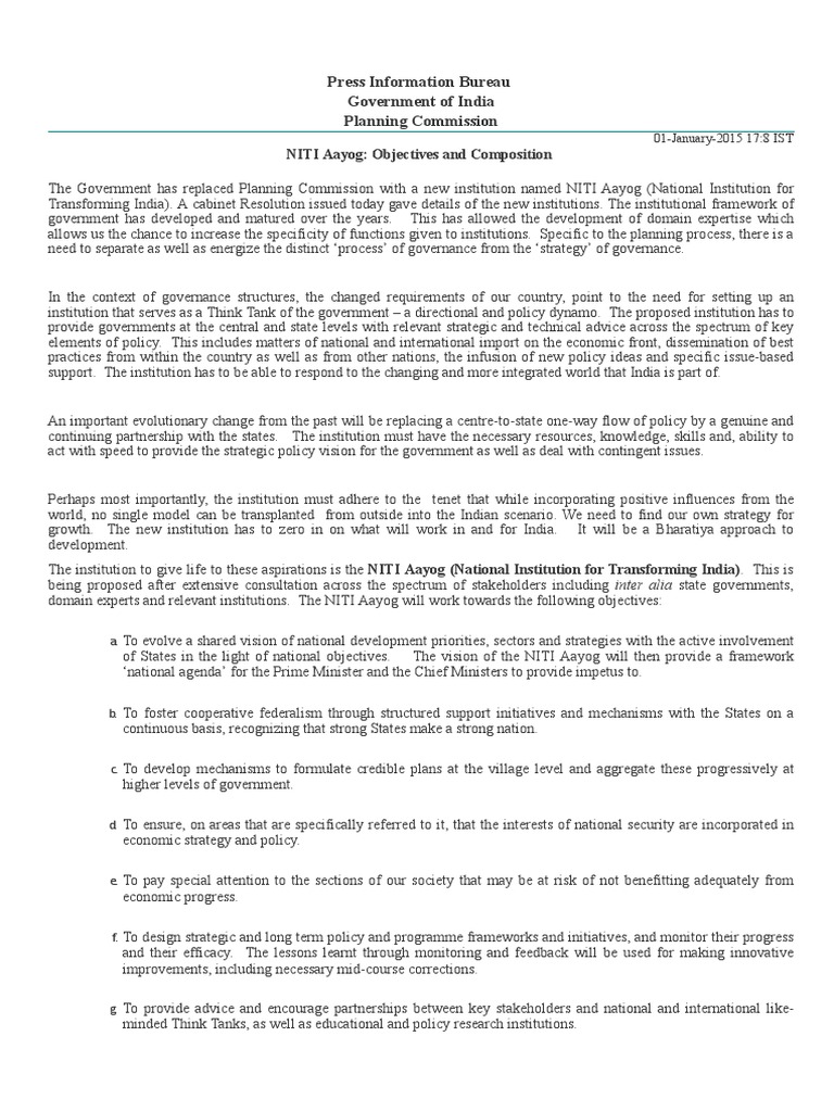 Niti aayog (national institution for transforming india) serves as a think tank of the government, a directional & policy dynamo. To evolve a shared vision of national development priorities, sectors and strategies with the active involvement of. Aimsandobjectivesofnitiayog niti aayog is essentially an advisory body that seeks to provide critical directional and strategic inputs documents similar to niti ayog_ aims, objectives and structure. Niti aayog worked with japanese counterparts to help launch first of its kind high speed railway project one of the key objectives to establish niti aayog was to actualize the goal of cooperative. The niti aayog (national institution for transforming india) created on 01/01/2015 serves as a think tank of. Explain the structure & functioning of niti aayog.how is it different than planning commission?who are economy niti aayog, planning commission: Read composition, objectives & need for reform in the erstwhile niti aayog. Composition of niti aayog, objectives, aims, relevance, role of niti aayog on social development goals this article talks about niti aayog, its composition, objectives, aims, and roles. The architecture, engineering and management aspects of the new institution, niti aayog, will have to be crafted carefully, if it is to serve as an institution to impart dynamism to the developmental process. It is a government of india initiative a 15 year 'vision' that covers all the objectives of the government to be fulfilled by the end of 15 years. Niti aayog will aim to accomplish the following objectives and opportunities The government realized that the planning commission had completed more than 6 decades of existence and become what are the objectives of niti aayog? It was important to boost the development of.